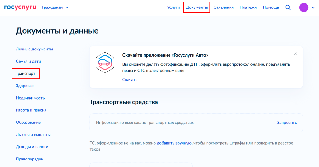 - На портале Госуслуг (gosuslugi.ru) — в разделе «Документы и данные», «Транспорт».