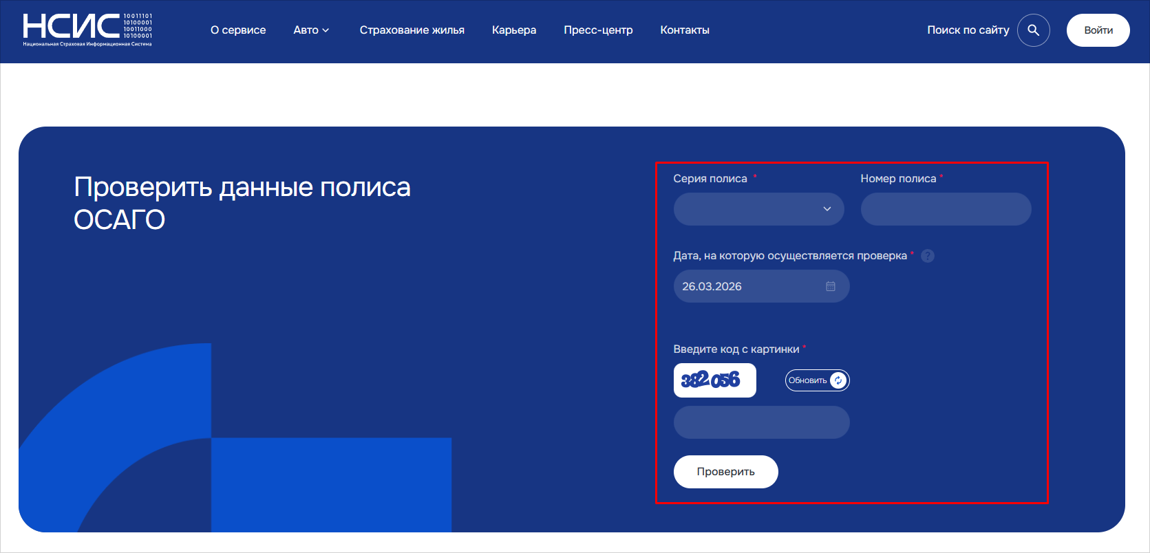 Форма для проверки полиса по номеру располагается на главной странице сайта НСИС. Введите серию и номер документа, проверочный код и нажмите «Проверить». Система покажет: