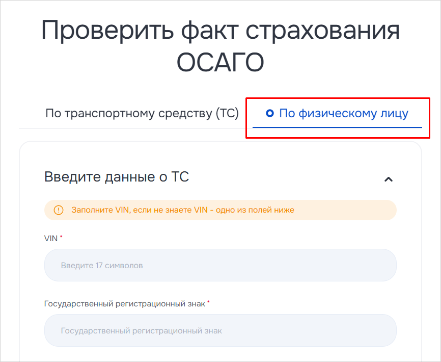 - На главной странице сайта НСИС через кнопку «Проверить наличие полиса ОСАГО» перейдите в раздел «Проверить факт страхования ОСАГО» и выберите «По физическому лицу».