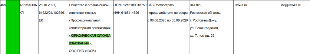 ООО «Юридическая Служба Взыскания» состоит в реестре ФССП с 2021 года. В базе организация находится под номером 458. Компания отмечена зеленым цветом, что соответствует низкой категории риска.