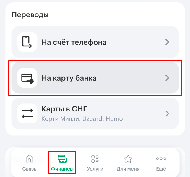 Откройте приложение и перейдите в раздел «Финансы» — «Переводы» — «На карту банка».