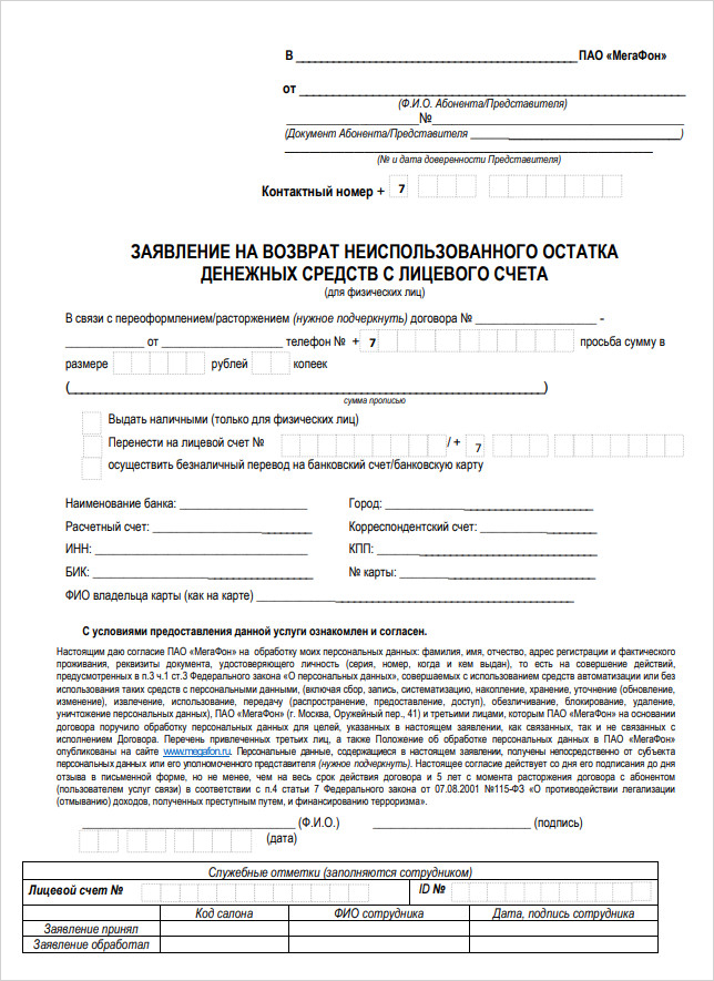 Для возврата нужно прийти в салон «МегаФона» с паспортом, заполнить заявление и указать банковские реквизиты. После этого деньги перечислят на карту или счет.