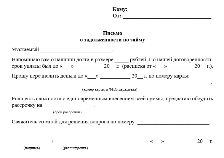 В отличие от уведомления, письмо носит менее формальный характер и составляется в произвольной форме. Это как дружеское напоминание о том, что хорошо было бы рассчитаться по долгам. Без жестких требований и упоминаний последствий.