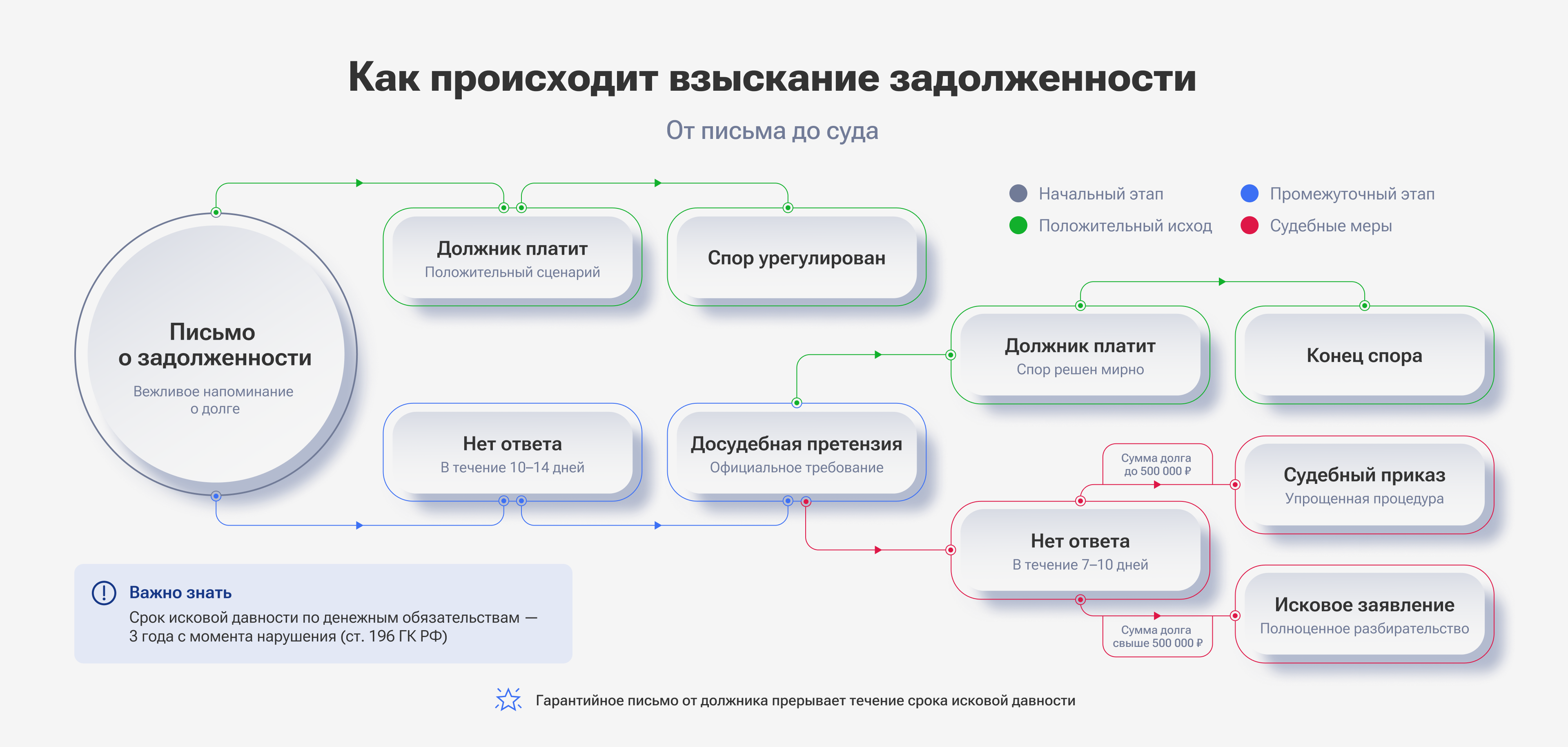 Нежелательный сценарий: должник прямо отказывается платить или игнорирует письмо. Если сумма долга меньше 500 000 рублей, взыскать ее можно по судебному приказу — это быстрее и проще, чем полноценное разбирательство. Если задолженность больше, придется подавать иск о взыскании.