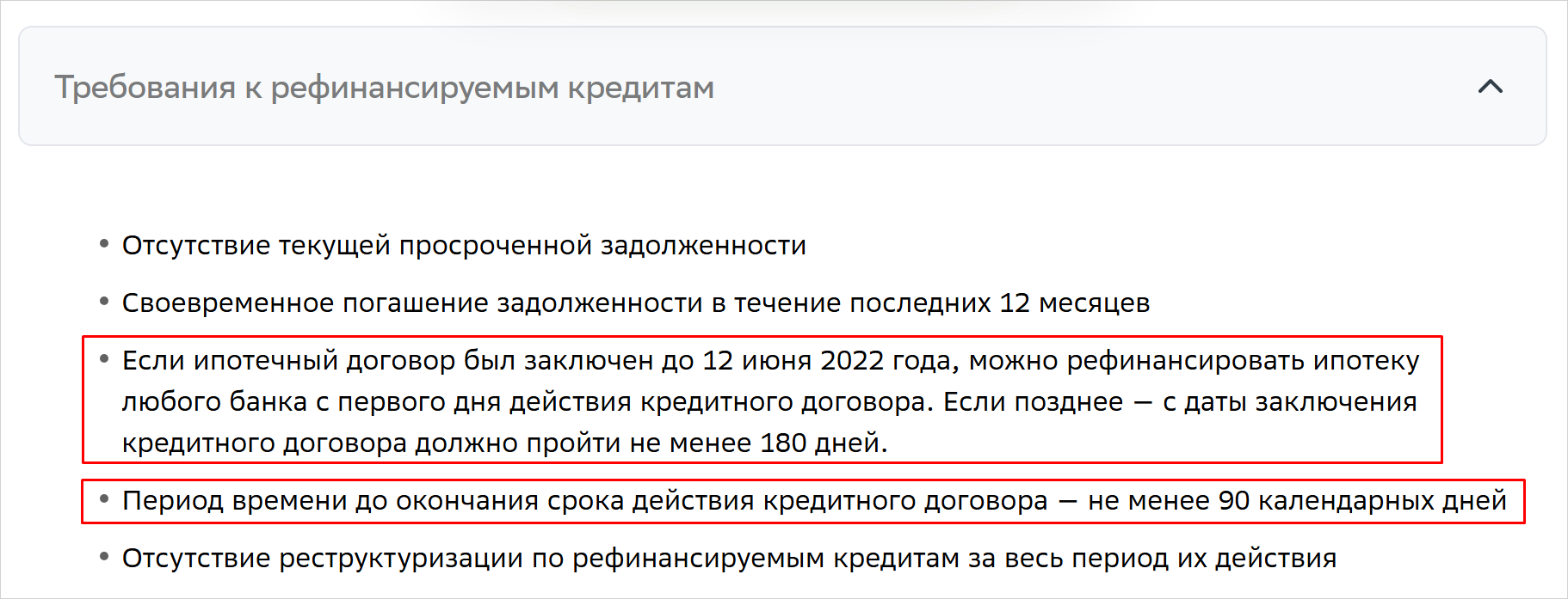Главное условие для рефинансирования — хорошая кредитная история, то есть никаких опозданий с платежами. Банки могут выдвигать дополнительные требования к возрасту ипотеки.