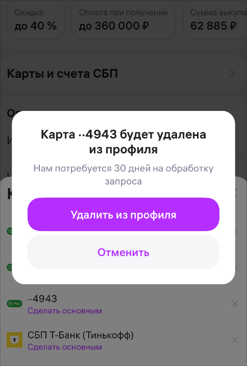 Важно: убрать можно только карту, по которой нет задолженностей (например, по рассрочке), а также неоплаченных товаров.