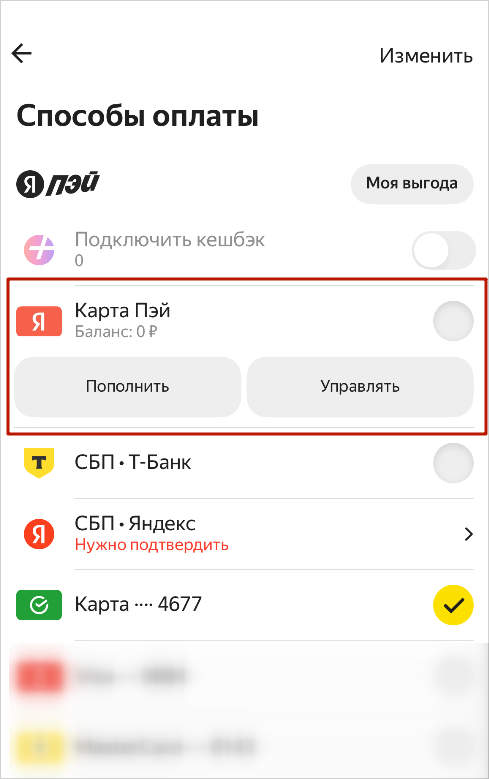 - Выберите «Способы оплаты», далее — «Карта Пэй», затем — «Управлять».