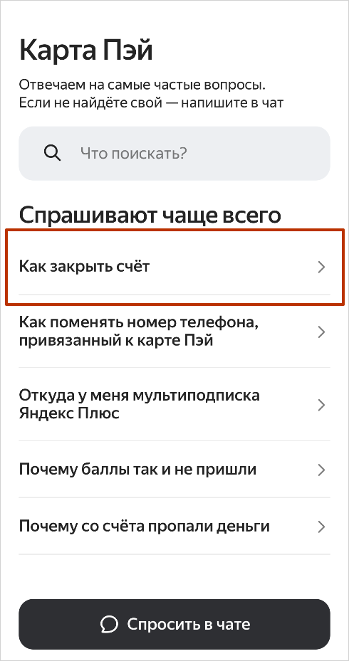 Если возникли трудности и вы не смогли закрыть счет в приложении или на сайте, задайте свои вопросы в поддержку. «Яндекс» рекомендует обращаться через чат в приложении или на сайте, потому что только так сотрудники смогут установить личность клиента и раскрыть данные об операциях по его карточке.