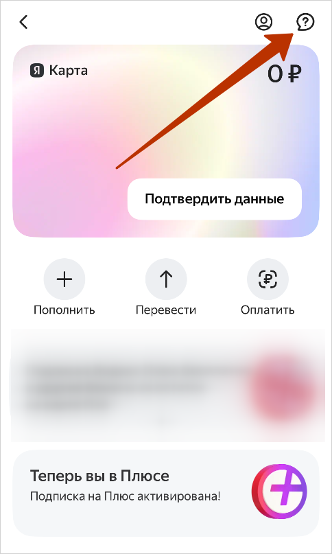 - Выберите карту «Пэй», далее — кликните на вопросительный знак в правом углу.
