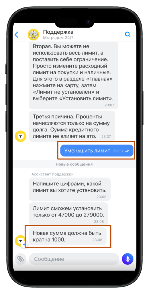 - Напишите в чате «Уменьшить кредитный лимит». Указывать причину не нужно.