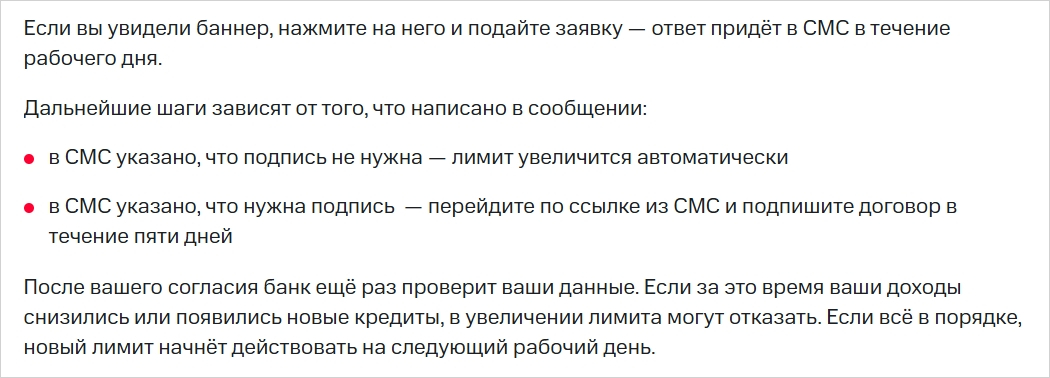Кроме того, банк может запросить справку о доходах, чтобы убедиться: вы сможете обслуживать повышенный лимит. Отказ ни на что не повлияет — можно попробовать снова через пару месяцев.