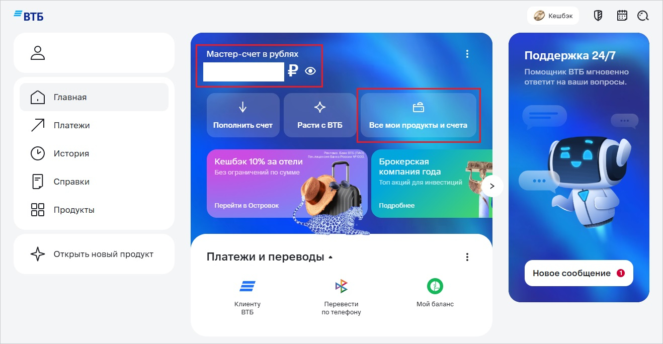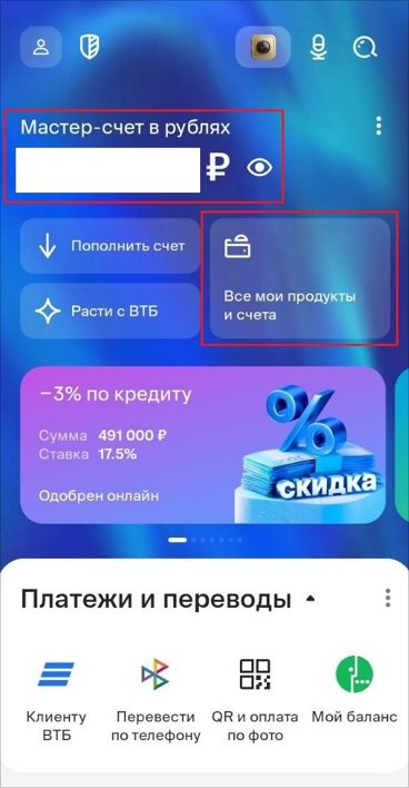 - Откройте «ВТБ Онлайн» и перейдите в раздел «Все мои продукты и счета».