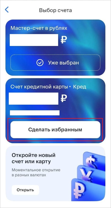 Избранным можно сделать любой счет (например, кредитный или накопительный) — тогда его баланс будет отображаться на главном экране «ВТБ Онлайн». Для этого раскройте меню рядом с названием счета и выберите «Сделать избранным».