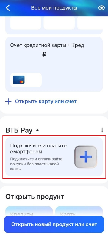- Раскройте блок «ВТБ Pay» и нажмите кнопку с синим плюсом.