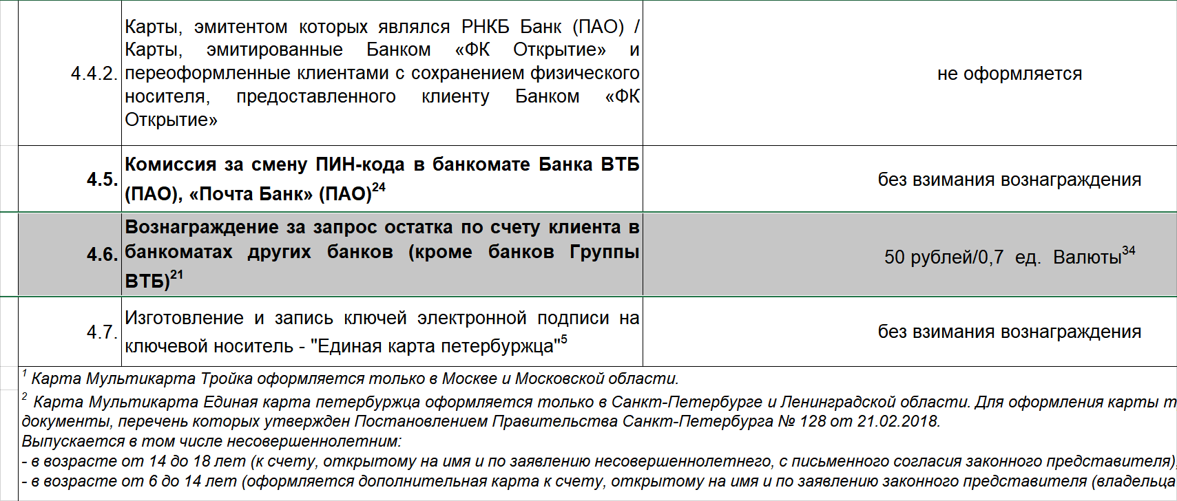 Важно: баланс проверяется бесплатно только в устройствах ВТБ и Почта Банка. Если вы запрашиваете его в банкоматах сторонних организаций, ВТБ удерживает комиссию — 50 рублей за каждую операцию.
