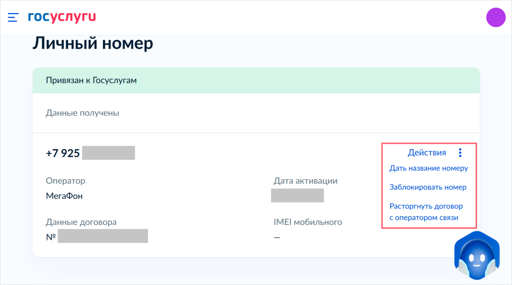 В карточке телефонного номера на Госуслугах есть кнопка «Действия». При нажатии на нее доступны два интересующих нас варианта: