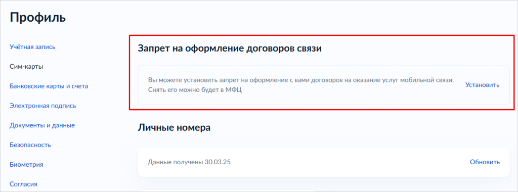 Функция «Запрет на оформление договоров связи» доступна в разделе сим-карт, в верхней части страницы. Она работает по аналогии с самозапретом на кредиты. При подключении этой функции никто, в том числе и вы сами, больше не сможет подключить новую SIM-карту по вашим паспортным данным. Чтобы поставить запрет: