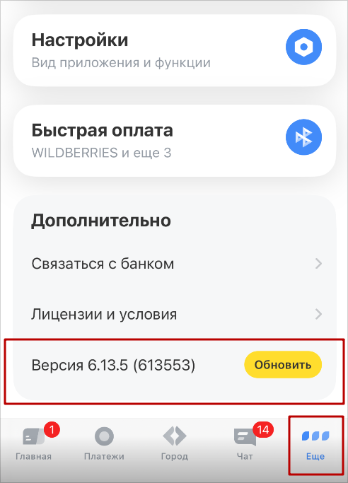 Чтобы проверить версию приложения «Тинькофф», откройте «Еще» и пролистайте страницу вниз.