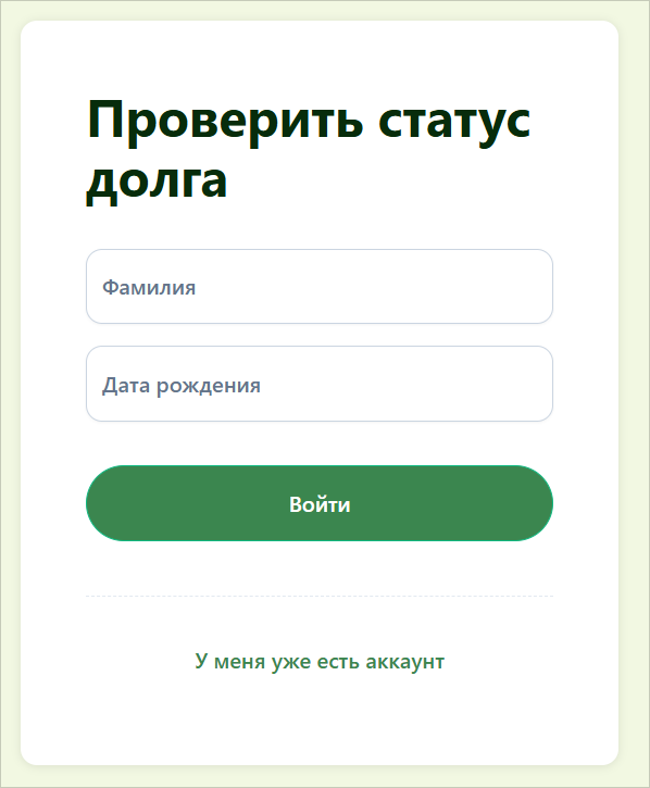 - Проверить статус долга онлайн. Для этого должнику необходимо войти в личный кабинет по фамилии и дате рождения.