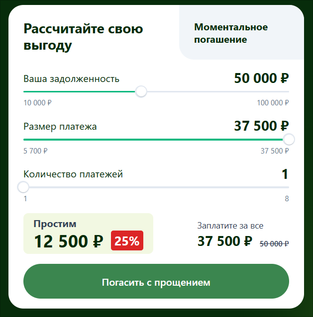 - Рассчитать выгоду от погашения долга по онлайн-калькулятору. Сервис покажет, какую скидку готовы предоставить коллекторы в зависимости от суммы и количества платежей. Максимум можно сэкономить 25% от суммы долга.