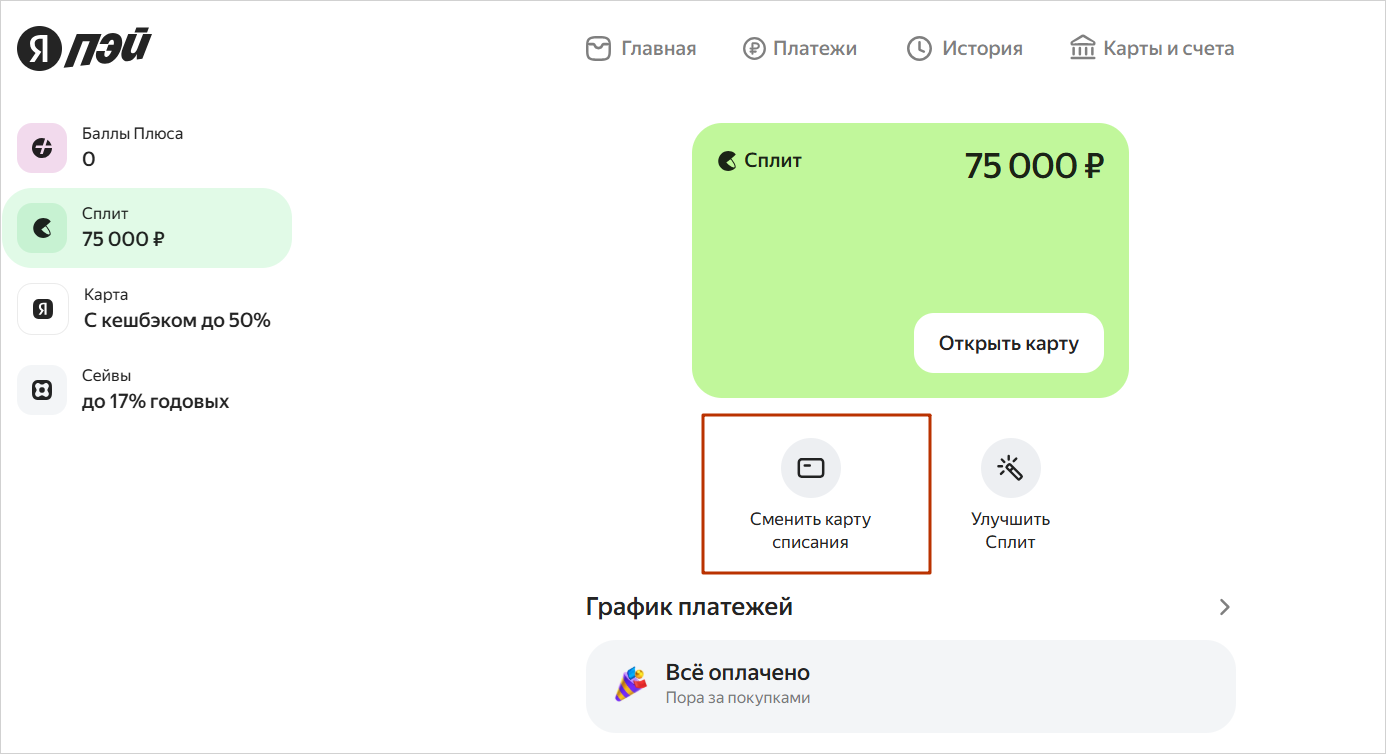 Карту для списаний можно изменить в личном кабинете «Яндекс Сплит»