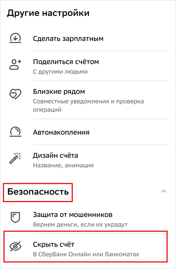- В подразделе «Безопасность» выберите «Скрыть счет».