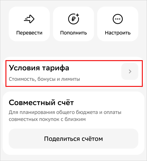 - Выберите дебетовую карту, затем откройте раздел «Условия тарифа».