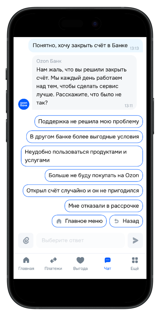 Чтобы полностью закрыть счет, необходимо расторгнуть договор обслуживания с Озон Банком. Отдельной кнопки «Расторгнуть договор» нет ни в приложении, ни на сайте банка, поэтому закрыть счет можно только через его службу поддержки. Есть три способа в нее обратиться: в онлайн-чате, по горячей линии и через «Почту России». Разберем все три варианта.