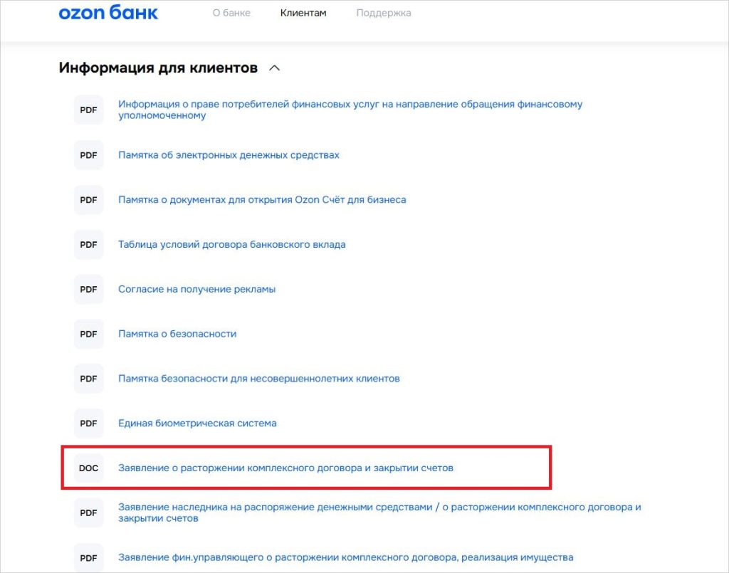 Скачайте и заполните бланк «Заявление о расторжении комплексного договора банковского обслуживания и закрытии счетов». Его можно найти в разделе «Клиентам» — «Информация для клиентов» на официальном сайте Озон Банка.