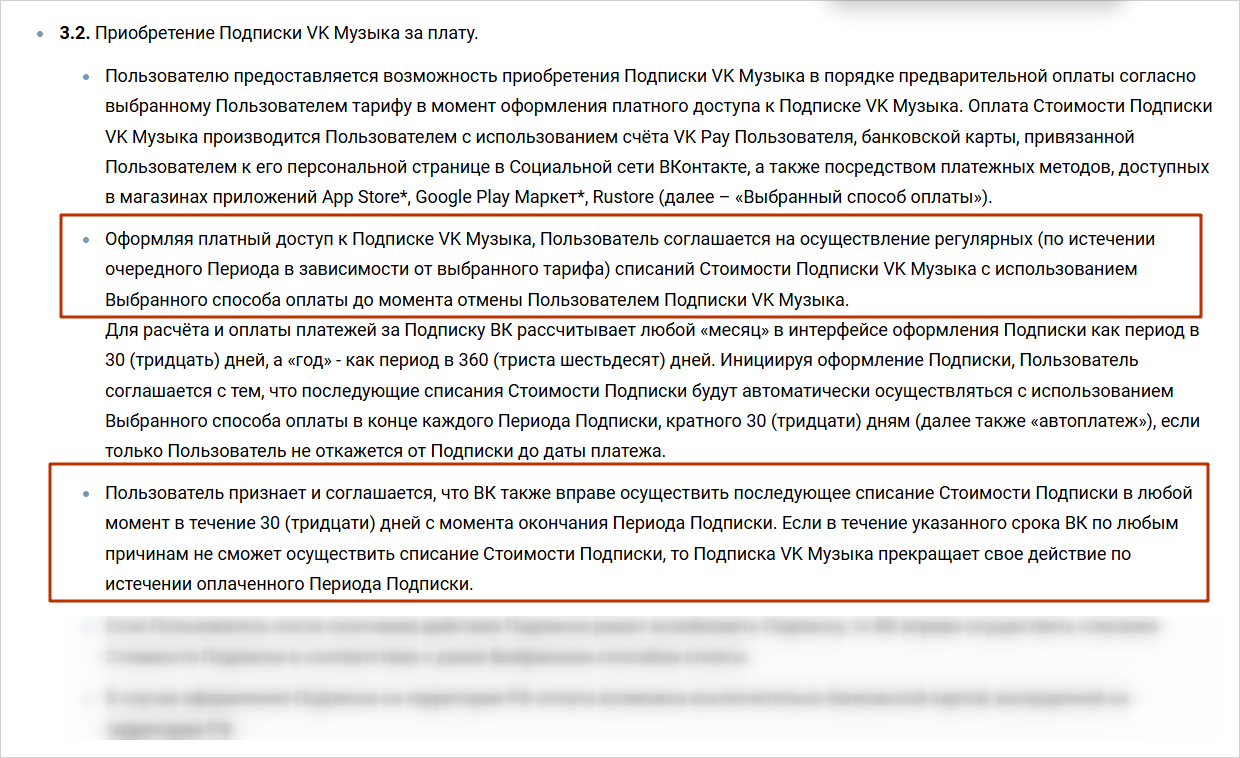 Так выглядит лицензионное соглашение на списание денег с карты за подписку «VK Музыка»