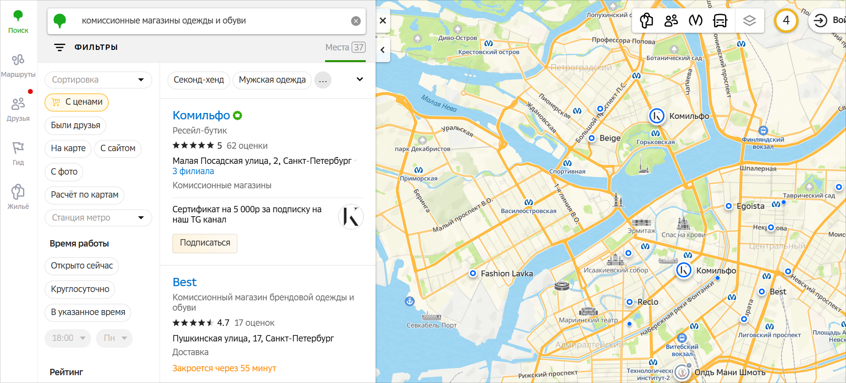 Еще один способ найти хорошую комиссионку — через онлайн-карты, например, «Яндекс.Карты» или «2ГИС».