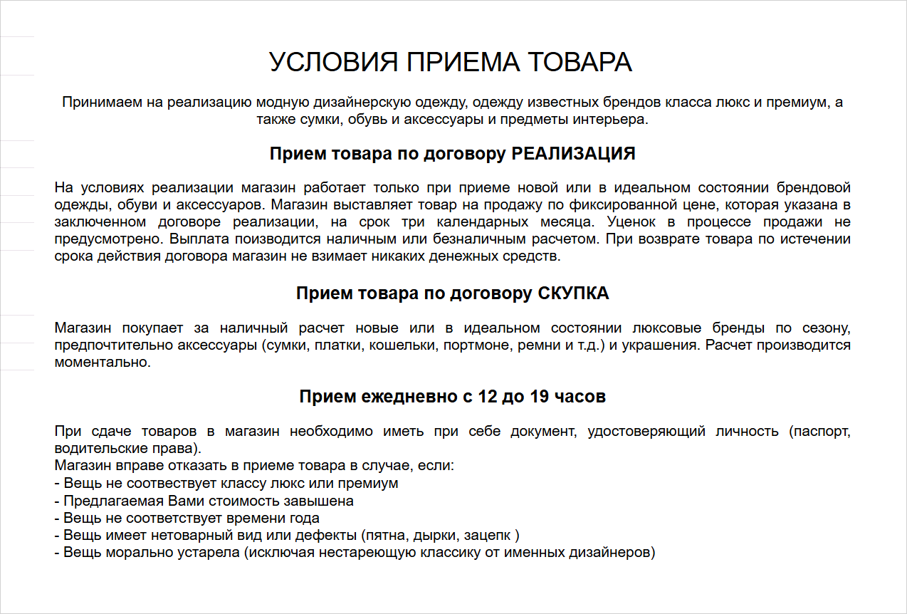 Так выглядят условия приема вещей в реальном комиссионном магазине: только люкс и премиум, два формата — реализация или скупка