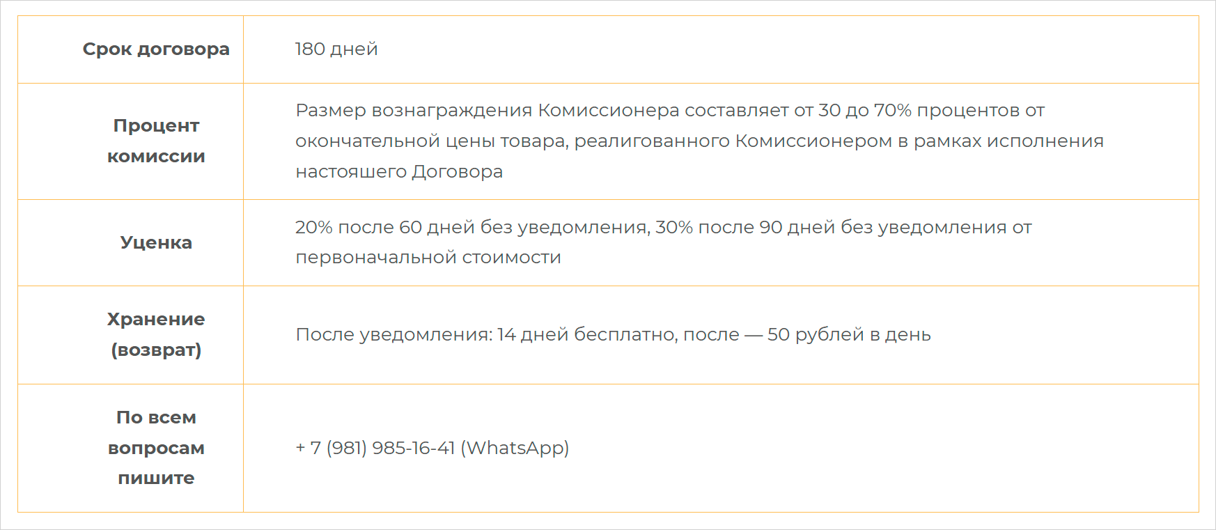 Пример реального договора: комиссия до 70%, уценка начинается с 60-го дня, а за хранение непроданных вещей после 14 дней берут 50 рублей в день