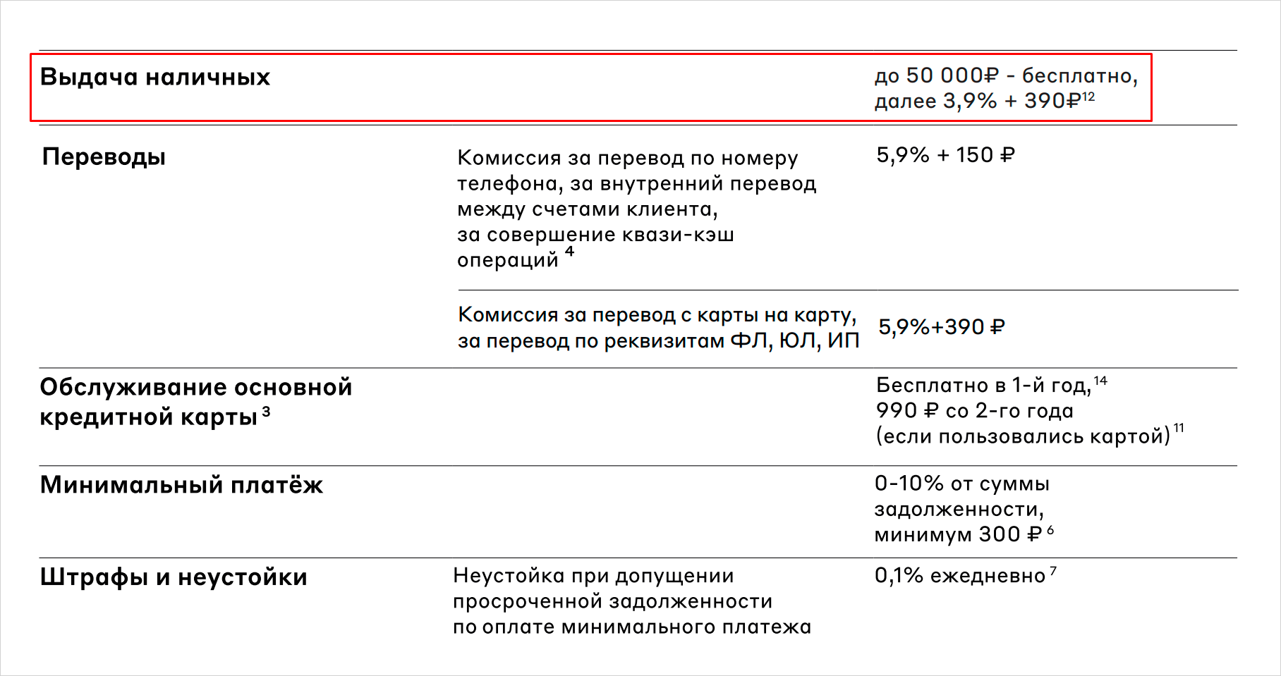 Снятие наличных без комиссии — до 50 000 рублей в месяц. Далее действует комиссия 3,9% от суммы снятия плюс 390 рублей за каждую операцию. Аналогичная комиссия взимается за переводы с карты на карту и по реквизитам.