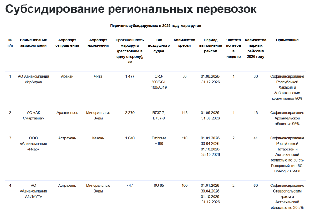 Список субсидируемых воздушных перевозок, утвержденных регионами на 2026 год.