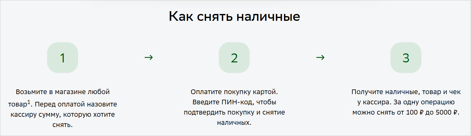 В магазинах-партнерах можно снять от 100 до 5 000 рублей за раз. Дневной лимит на выдачу наличных в магазинах — 20 000 рублей. При этом комиссии за снятие нет, если получать деньги в пределах лимитов.