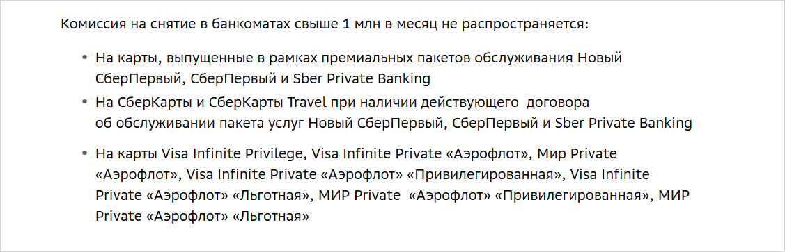 Но есть карты и пакеты услуг, с которыми можно снимать в банкоматах Сбербанка больше 1 млн рублей без комиссии. Например, это касается премиальных карт «Инфинити». Вот полный список исключений: