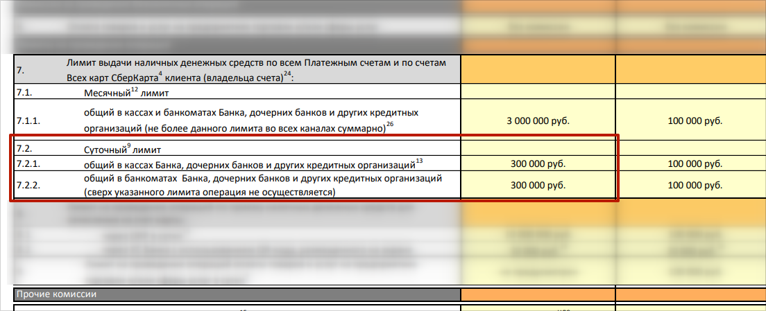 Лимит в месяц равен суточному — 100 000 рублей. В банкоматах и в отделениях Сбера можно снимать по 50 000 рублей. В иностранной валюте в месяц выдадут до 3 000 долларов или до 2 500 евро. |