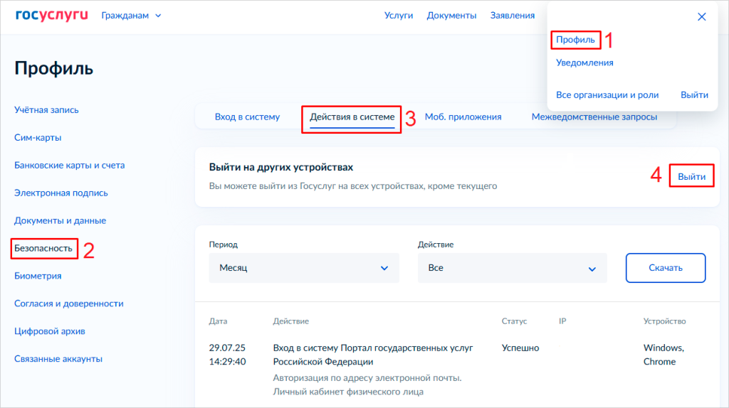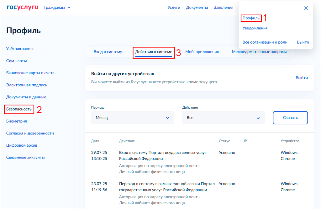 5. Сделайте скриншоты всех подозрительных действий в аккаунте — в разделе «Безопасность». Если вам звонили и спрашивали код для входа на портал, сохраните входящие номера.