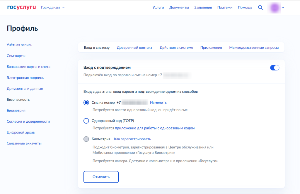 Настройте двухфакторную аутентификацию в разделе «Вход с подтверждением». Есть несколько вариантов: одноразовый код в смс или TOTP — виртуальный код из приложения, вход по биометрии.