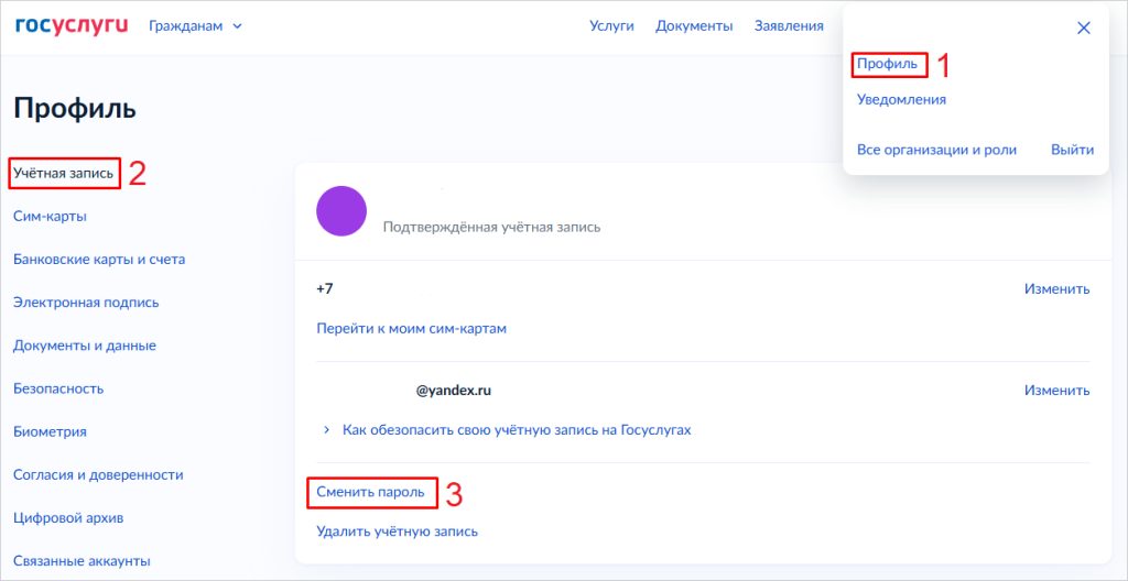 3. Если удалось войти по старому паролю, смените его на новый. Это можно сделать в разделе «Профиль», «Учетная запись», затем — «Сменить пароль».