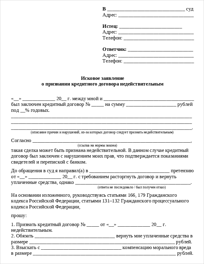 9. Подайте исковое заявление в суд и потребуйте, чтобы кредитный договор признали недействительным. В качестве ответчика укажите кредитную организацию, выдавшую деньги.