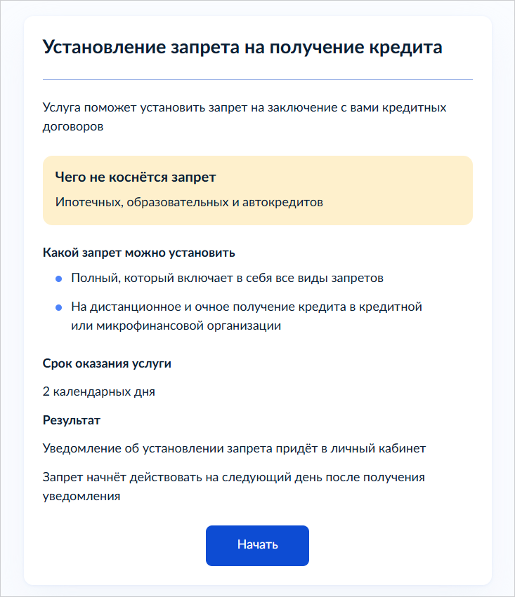 Чтобы обезопасить себя от чужих кредитов, настройте запрет на их оформление — это можно сделать на Госуслугах и в любом МФЦ.