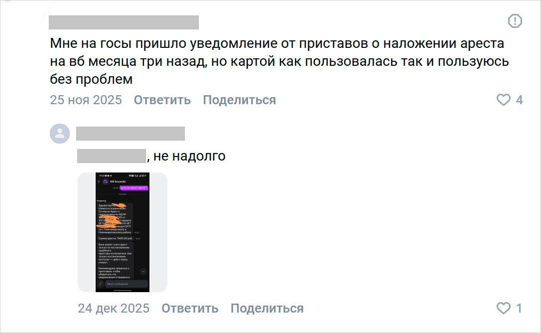 Сначала деньги на ВБ-кошельке арестовывают, а после — взыскивают. Взыскание означает, что ваши сбережения переводят на депозит приставов, а уже оттуда — их перечисляют взыскателю.