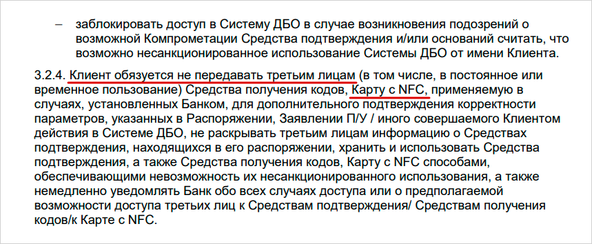Невозврат средств при мошенничестве. Если клиент добровольно передает карту жене или кому-то еще, банк снимает с себя ответственность за любые операции, совершенные по ней. Если родственник потеряет карту или ее данные будут скомпрометированы, банк не обязан компенсировать утраченные деньги.