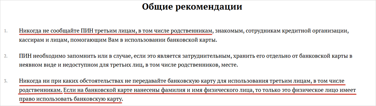 Человек не вправе передавать свою банковскую карту и тем более сообщать пин-код от нее никому — даже супругу, которому он полностью доверяет. Это прямое нарушение договора с банком.