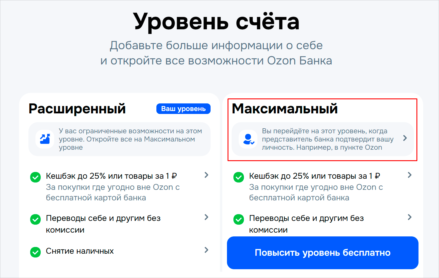 Перевести деньги с кредитки на другой свой счет в Ozon Банке можно лишь с Максимальным уровнем счета. Только с этого уровня кошелек, открытый в Ozon, является полноценным банковским счетом. Проверить текущий уровень счета можно на сайте или в приложении Ozon Банка.