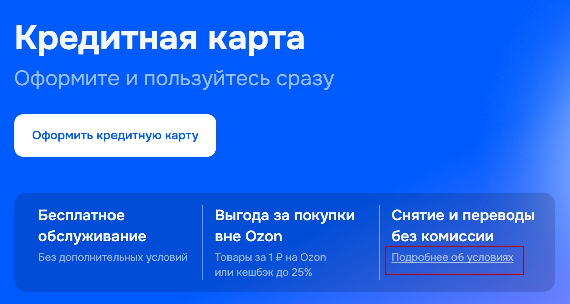 Акция о переводах с кредитки без комиссии в Ozon называется «Обслуживание на особых условиях». Чтобы стать ее участником, необходимо: