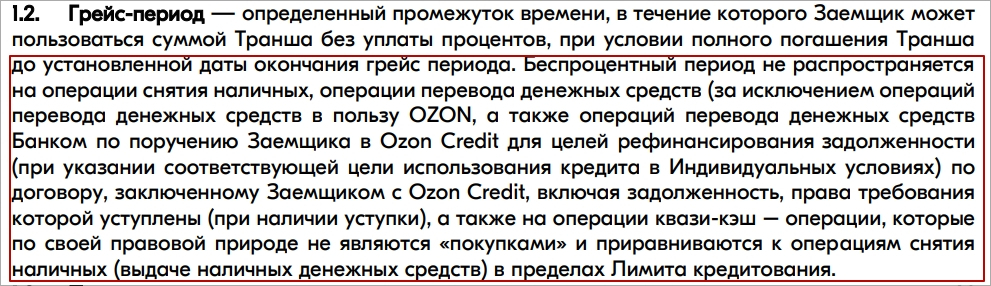 В п. 1.2 Общих условий Ozon предупреждает, что грейс-период не распространяется на переводы, но не все подробно читают такие документы.