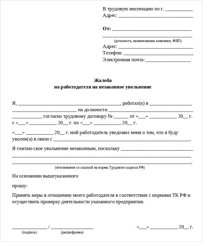Обратиться в прокуратуру. Это можно сделать как до, так и после незаконного увольнения. Срок рассмотрения жалобы — 30 дней. Обращение можно лично отнести в районную прокуратуру, отправить заказным письмом или онлайн — через интернет-приемную.